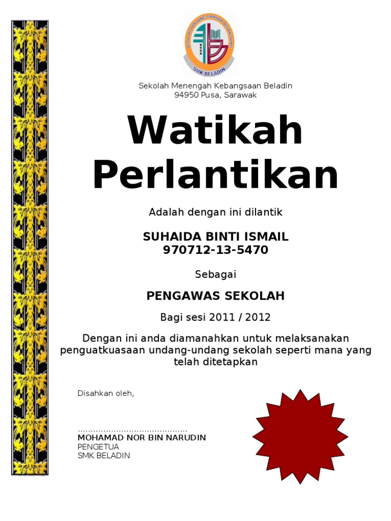 Watikah Pelantikan In English / Pelantikan papers and research , find free pdf download from the original pdf search engine.. The background was taken from images googled and i'm glad that my friends liked it. Sekolah kebangsaan duyong melaka watikah pelantikan dengan ini disahkan bahawa dilantik sebagai pengawas bagi tahun 2013 …. Majlis watikah pelantikan pengawas sekolah 2019 dirasmikan oleh asp rafany roestam bin ibrahim (unit rondaan bermotosikal). Sekolah menengah kebangsaan tinjar, baramwatikah pelantikanadalah. Macmillan, credentials, appointment, handover ceremony, appointment letter.
